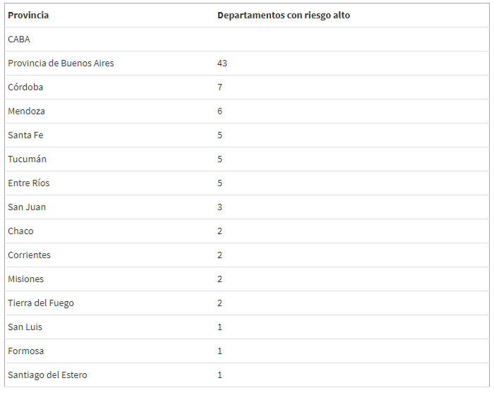 ¿Cuáles son las jurisdicciones y departamentos con alto riesgo epidemiológico en la Argentina? Más allá de la Ciudad Autónoma de Buenos Aires, se encuentran: provincia de Buenos Aires (con 43 departamentos), Córdoba (con siete departamentos, incluida la capital provincial), Mendoza (con seis departamentos, incluida la capital), Santa Fe (con cinco departamentos, incluida Rosario), Tucumán (cinco departamentos, incluida San Miguel de Tucumán), Entre Ríos (cinco departamentos), San Juan (tres departamentos, incluida su capital), Chaco (dos departamentos), Corrientes (dos departamentos), Misiones (dos departamentos), Tierra del Fuego (dos departamentos), San Luis (un departamento), Formosa (un departamento) y Santiago del Estero (un departamento), según la Dirección Nacional de Epidemiología e Información Estratégica con datos extraídos del SNVS 2.0 y reportes provinciales.