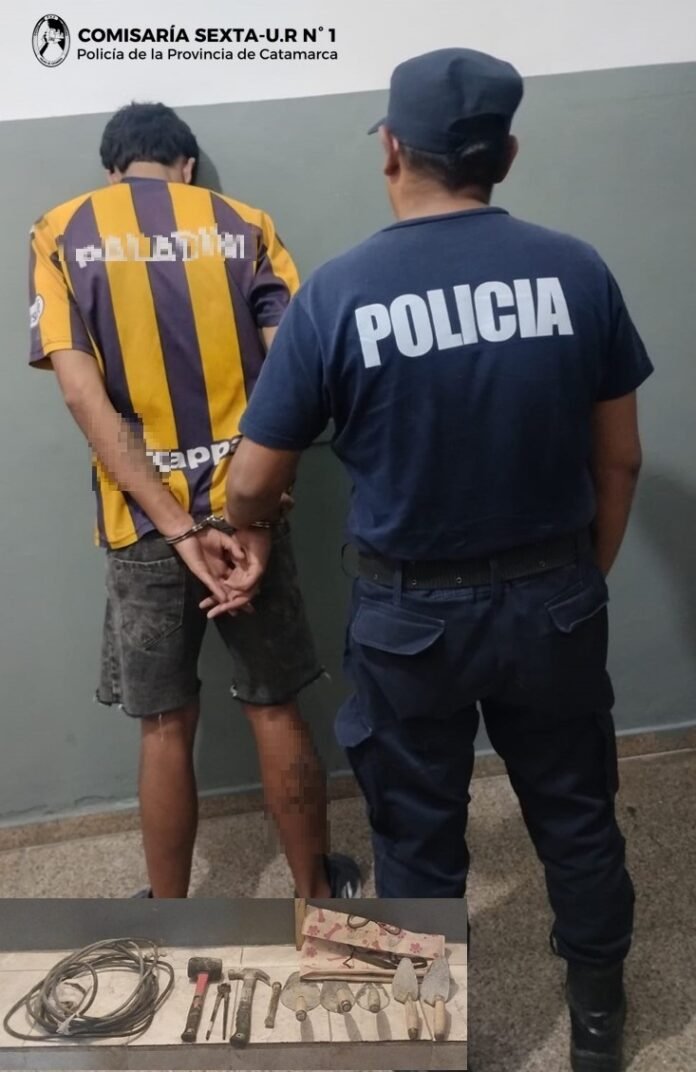 En la madrugada de hoy, a las 02:40, en la avenida Bonifacio Cobacho, entre calles Gob. Aramburu y Domingo de Ocampo, numerarios de la Comisaría Sexta aprehendieron a un sujeto de apellido Agüero (26), quien habría sido sorprendido llevando una bolsa de tela que contenía cinco (05) cucharas de albañil, un (01) cortafierro, dos (02) martillos, una (01) tenaza Gherardi y un (01) prolongador de corriente de 8 metros, de los cuales no pudo acreditar su legítima propiedad y procedencia.