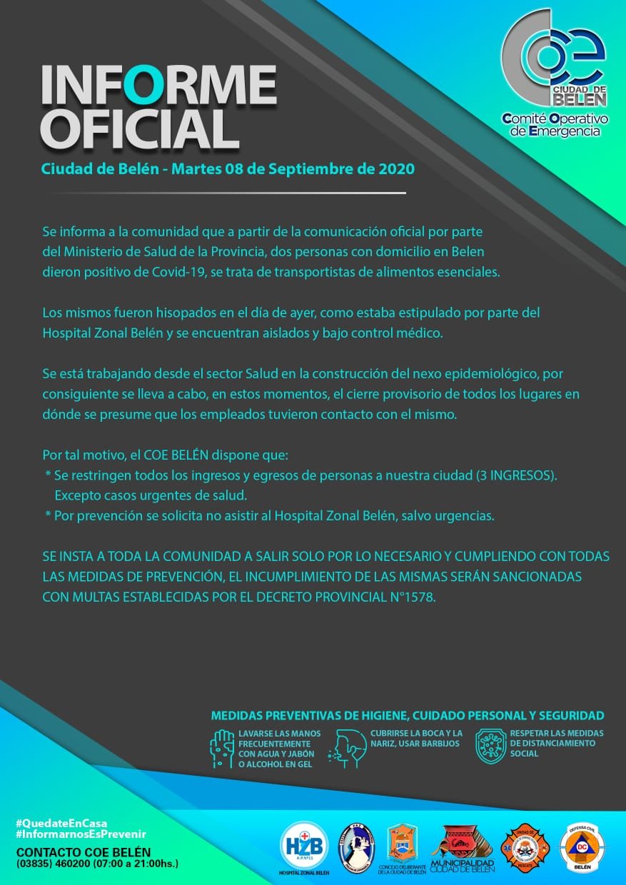 Al mismo tiempo, en Belén se dispuso la restricción de todos los ingresos y egresos de personas a la ciudad (3 ingresos), a excepción de urgencias. Además se solicitó no concurrir al Hospital Zonal de Belén, salvo por urgencias
