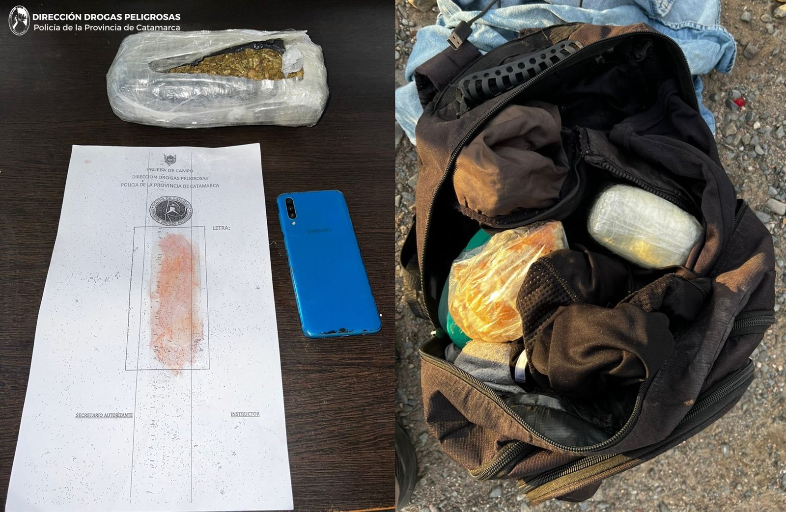 En ese momento y con la ayuda de la can “Laika”, adiestrada para detectar estupefacientes, el interviniente personal encontró en una mochila, que sería propiedad de un joven de 25 años de edad, oriundo de la Prov. de Santa Cruz, un paquete envuelto con cinta de embalar transparente, con una sustancia tipo herbácea que al ser sometida a la prueba de campo correspondiente, arrojó como resultado que se trataría de 640 Grs. de Marihuana, que quedó en calidad de secuestro, al igual que un teléfono celular.