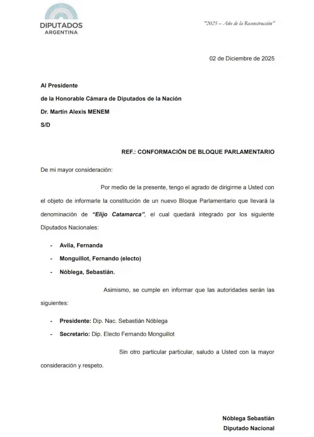 La conformación del bloque quedó formalizada este martes mediante una nota enviada al presidente de la Cámara de Diputados, Martín Menem. En el documento, los legisladores informaron la constitución del espacio y detallaron que estará integrado por Fernanda Ávila, Fernando Monguillot y Sebastián Nóblega.