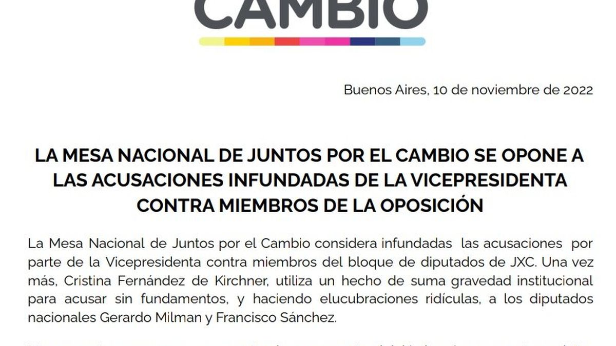 La Mesa Nacional de Juntos por el Cambio salió en defensa del diputado nacional Gerardo Milman acusado por la vicepresidenta Cristina Fernández de Kirchner de estar involucrado en el atentado en su contra del 1 de septiembre y aseguró que “monta relatos infundados”.
