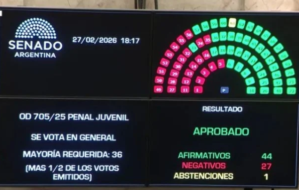 El Senado de la Nación Argentina sancionó este jueves el nuevo Régimen Penal Juvenil, una norma que baja la edad de imputabilidad de 16 a 14 años y que le dio al oficialismo una nueva victoria legislativa. La iniciativa fue aprobada con 44 votos a favor y 27 en contra, tras un debate extenso y cargado de tensión dentro y fuera del recinto.