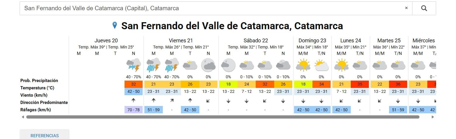 Jueves 20: Probabilidad de precipitaciones entre el 40% y 70%, tormentas durante la tarde y noche, temperaturas entre 25°C y 39°C, y ráfagas que pueden llegar a 78 km/h.