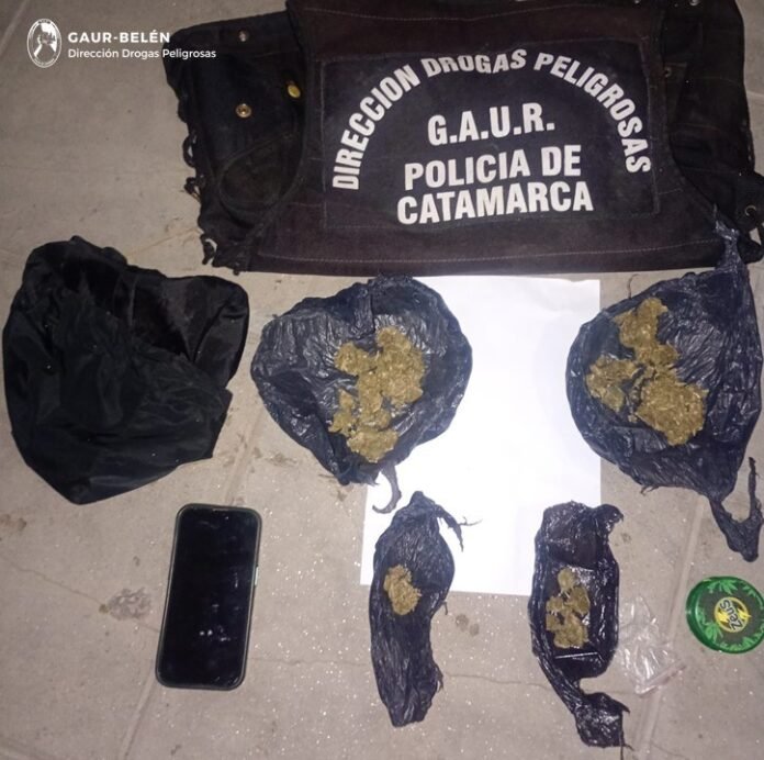 En la jornada de ayer, tras realizar tareas investigativas, en inmediaciones a la playa de estacionamiento de un establecimiento escolar ubicado en la Avenida de Circunvalación S/N°, de la Ciudad de Belén, Dpto. homónimo, numerarios del Grupo Antinarcóticos de Unidades Regionales (GAUR-Belén), dependientes de la Dirección Drogas Peligrosas de la Policía de la Provincia, cumplimentaron una orden de requisa personal e identificaron a un joven de 23 años de edad, a quien entre sus pertenencias le encontraron bolsas de plástico que contenían una sustancia herbácea, que al ser sometida a la prueba de campo correspondiente arrojó como resultado que se tratarían de 56 gr. de Marihuana, que fueron secuestrados, al igual que un (01) teléfono celular IPhone y una (01) motocicleta Motomel Blitz 110 cc.