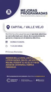 En segundo lugar, los trabajos se llevarán a cabo en el departamento Santa María, en el horario de 7 hasta 12 horas, y se verán afectados los siguientes lugares: Barrio Chacarita, San Pío, Las Américas, San Agustín, Virgen Del Valle, Jardín, Santa Mónica, Los Sauces, El Tope.