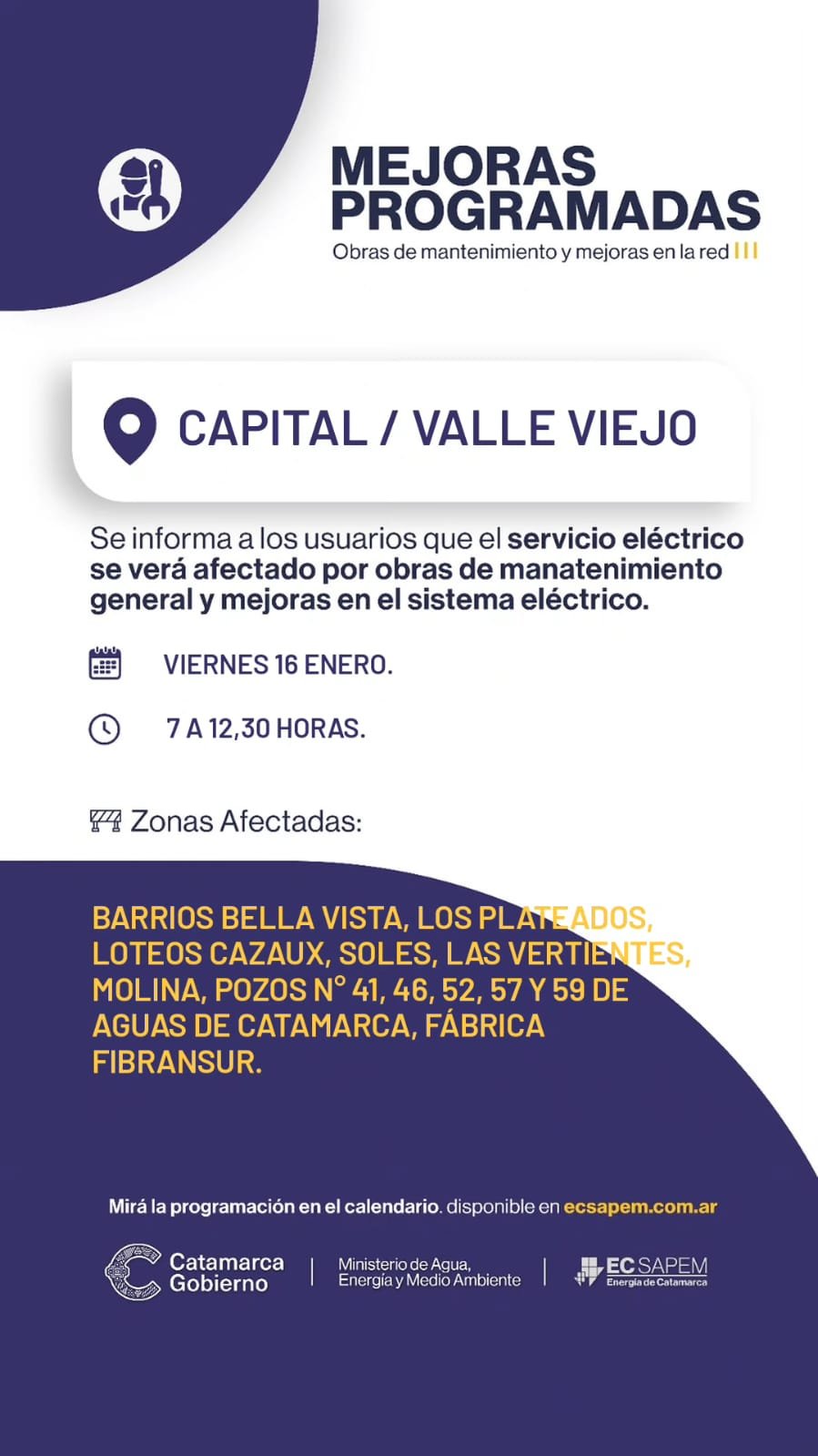 En primer lugar, trabajos en Capital y Valle Viejo, desde las 7 hasta las 12:30 horas, afectarán las zonas de Barrios Vella Vista, Los Plateados, Loteos Cazaux, Soles, Las Vertientes, Molina, Pozos N° 41, 46, 52, 57 y 59 de Aguas de Catamarca, Fabrica Fibransur.