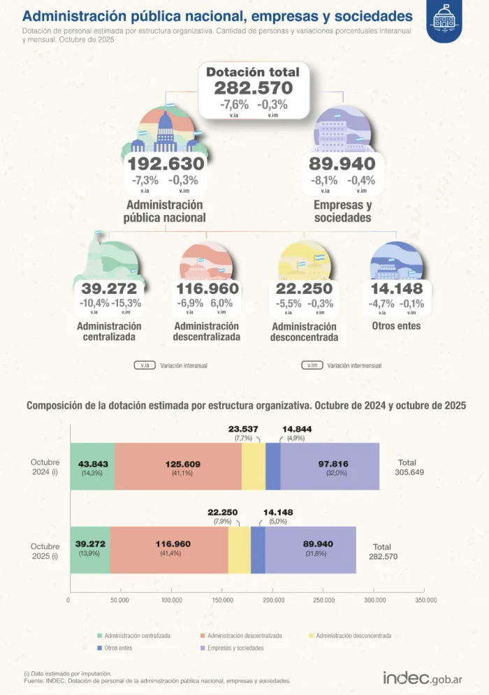Los datos se desprenden del informe sobre dotación de personal de la administración pública nacional, empresas y sociedades que difunde mensualmente el Instituto Nacional de Estadísticas y Censos (INDEC).