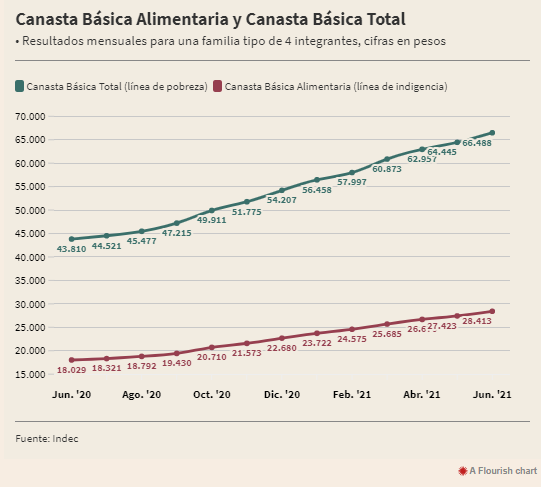 Según reveló esta tarde el Indec, la Canasta Básica Alimentaria quedó fijada en 28.414 pesos en junio para una familia de cuatro miembros, mientras que la Canasta Básica Total se ubicó en $ 66.488, casi dos veces y media el salario mínimo vital y móvil que rige desde el 1° de julio ($ 27.216).