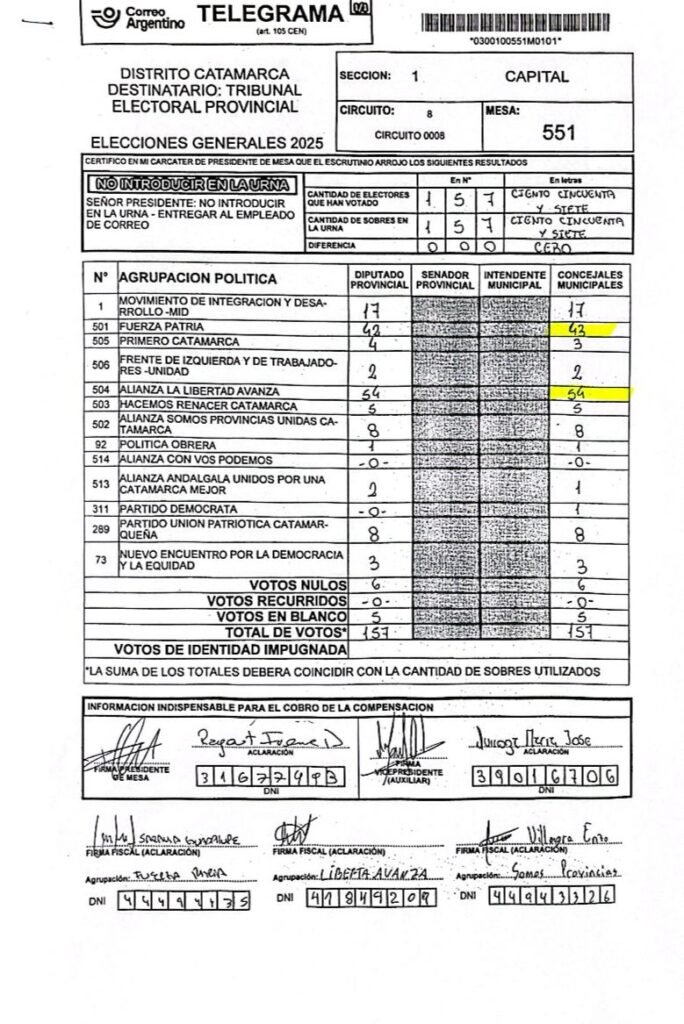 Mesa 551 (Escuela Municipal N°1): LLA afirma haber conseguido 54 votos contra 43 de Fuerza Patria, aunque en los resultados publicados aparecen 71 votos para Fuerza Patria y 61 para LLA.