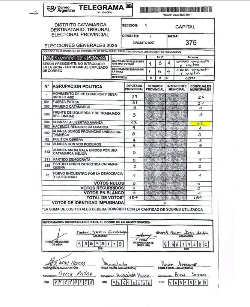 Mesa 375 (Colegio Fasta): La Libertad Avanza asegura haber obtenido 42 votos, mientras que en la página oficial solo figuran 4.