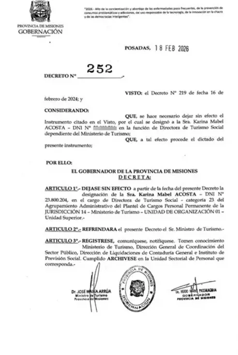 Se trata de Karina Mabel Acosta, quien se desempeñaba como Directora de Turismo Social en la provincia. Su salida fue dispuesta por el gobernador Hugo Passalacqua, mediante el Decreto 252, mientras la funcionaria aún se encontraba en México.