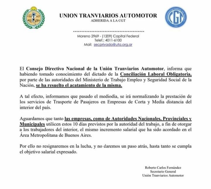 El levantamiento de la medida de fuerza fue confirmado por Secretario General Unión Tranviarios Automotor, Roberto Carlos Fernández, a través de un comunicado en el que informó que “pasado el mediodía, se irá normalizando la prestación de los servicios de Trasporte de Pasajeros en Empresas de Corta y Media distancia del interior del país”.