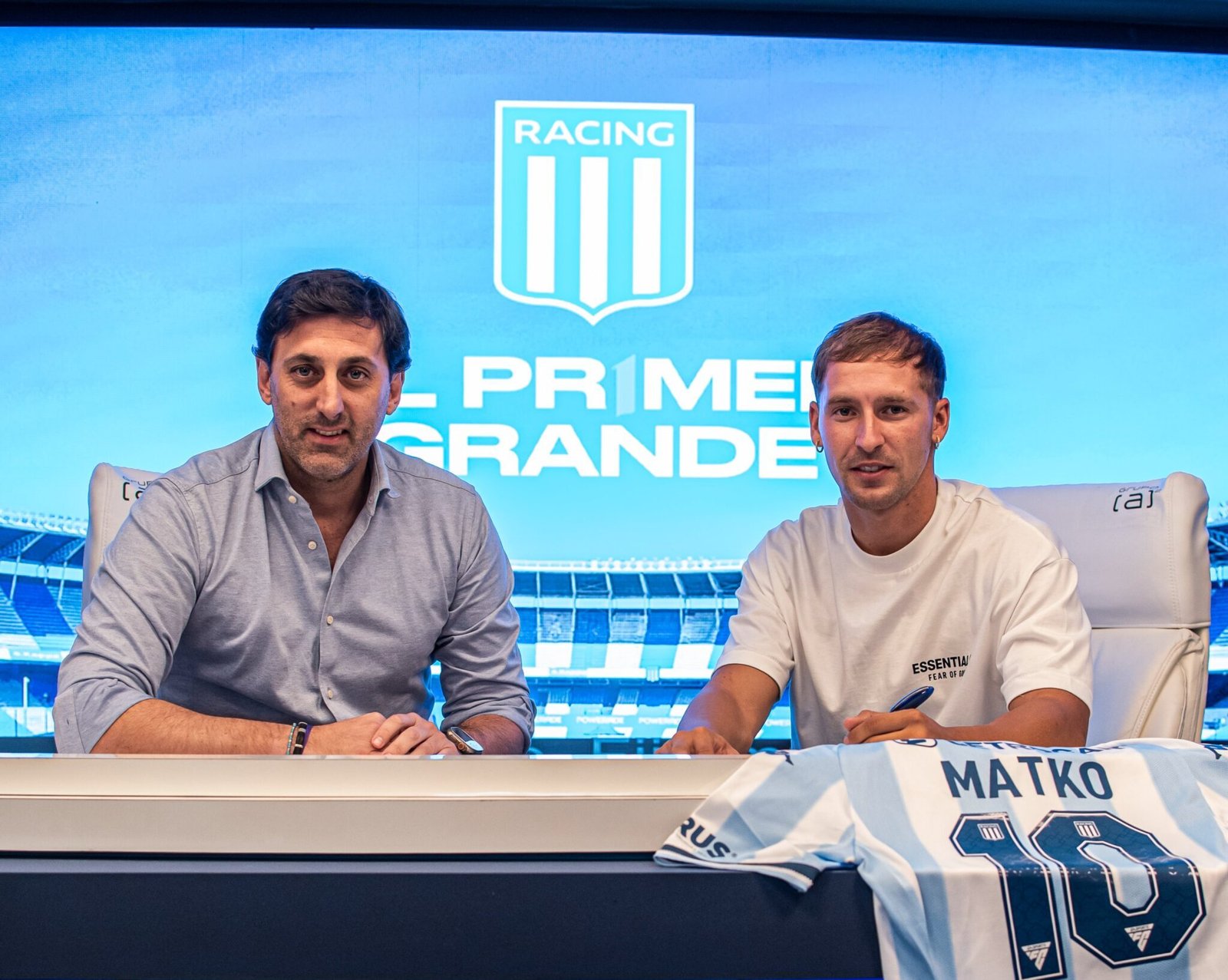“¡Llegó Matko! Matko Miljevic es jugador de Racing Club. El mediocampista proveniente de Huracán ya firmó su contrato con La Academia hasta diciembre de 2029. ¡Vamos por todo!”, publicó la institución, junto a una serie de imágenes del futbolista, incluida la firma del contrato junto al presidente Diego Milito.