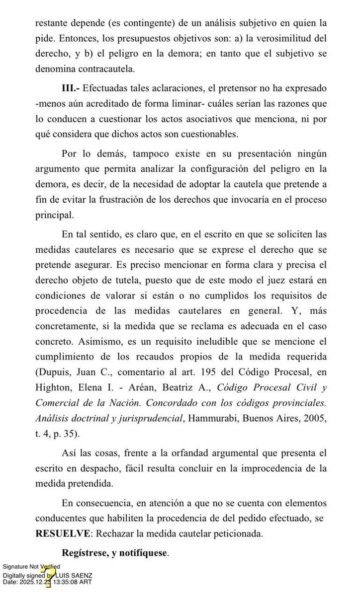 En consecuencia, la Justicia resolvió rechazar la medida cautelar peticionada, dejando firme la situación institucional actual del club.