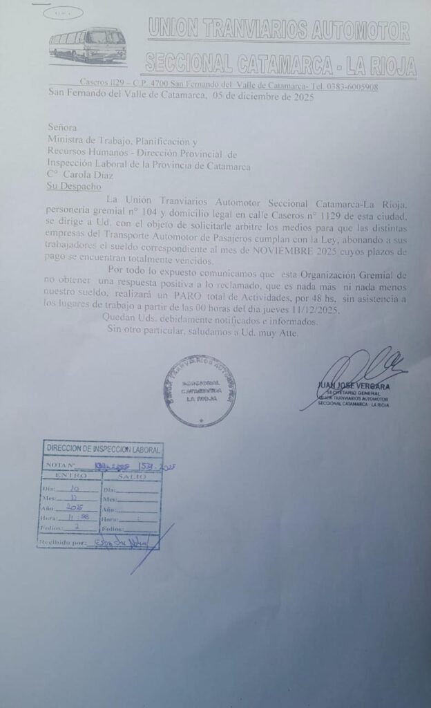 La Unión Tranviarios Automotor (UTA) Seccional Catamarca–La Rioja anunció un paro total de actividades ante la falta de pago de los sueldos correspondientes al mes de noviembre de 2025. Según informó el sindicato, las empresas de transporte público de pasajeros no cumplieron con los plazos legales de pago, situación que motivó una presentación formal ante el Ministerio de Trabajo y la Dirección de Inspección Laboral.