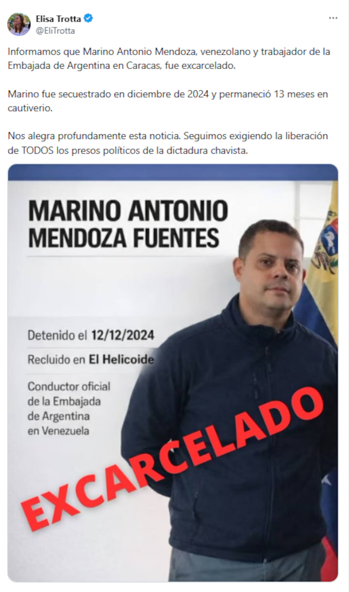 La noticia de su liberación fue confirmada por la activista opositora Elisa Trotta a través de la red social X, quien señaló que Mendoza “fue secuestrado en diciembre de 2024 y permaneció 13 meses en cautiverio” y destacó que la excarcelación representa un alivio para su entorno. Trotta agregó que “seguimos exigiendo la liberación de todos los presos políticos en Venezuela”.