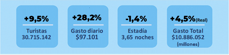 En cambio, el gasto diario por turista alcanzó los $97.101, resultando nominalmente mayor al año pasado (+28,2%), pero 3,3% menor cuando se quita el impacto de la inflación (a precios reales).